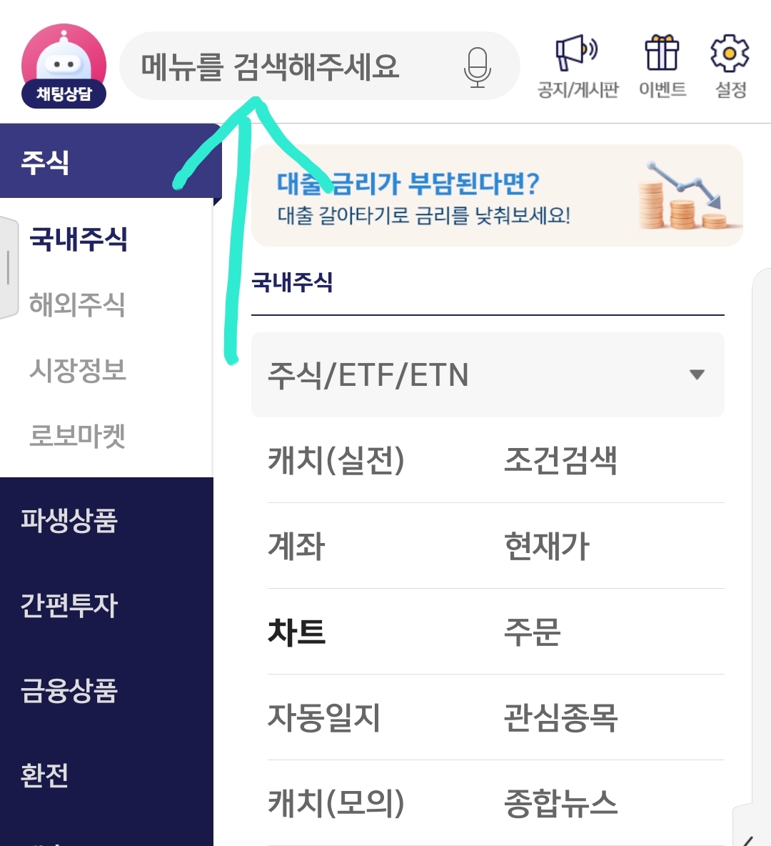 우선 영웅문에서 이서비스를 이용하기 위해서는 메뉴에서 국내주식>빅데이터>실시간조회순위를 통해 접속할 수 있습니다. 더욱 쉬운 방법은 메뉴버튼을 누른 후 검색창에 '실시간'이라고 치면 아래 화면과 같이 서비스명이 뜹니다. 관심종목 또는 빅데이터 모두 똑같은 서비스이기 때문에 아무것이나 눌러도 상관없습니다.
